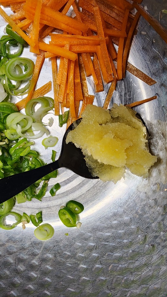 당근을 30g 가늘게 채썰어 용기에 담고, 대파, 청양고추 채 썬 것과 간 마늘 1스푼,