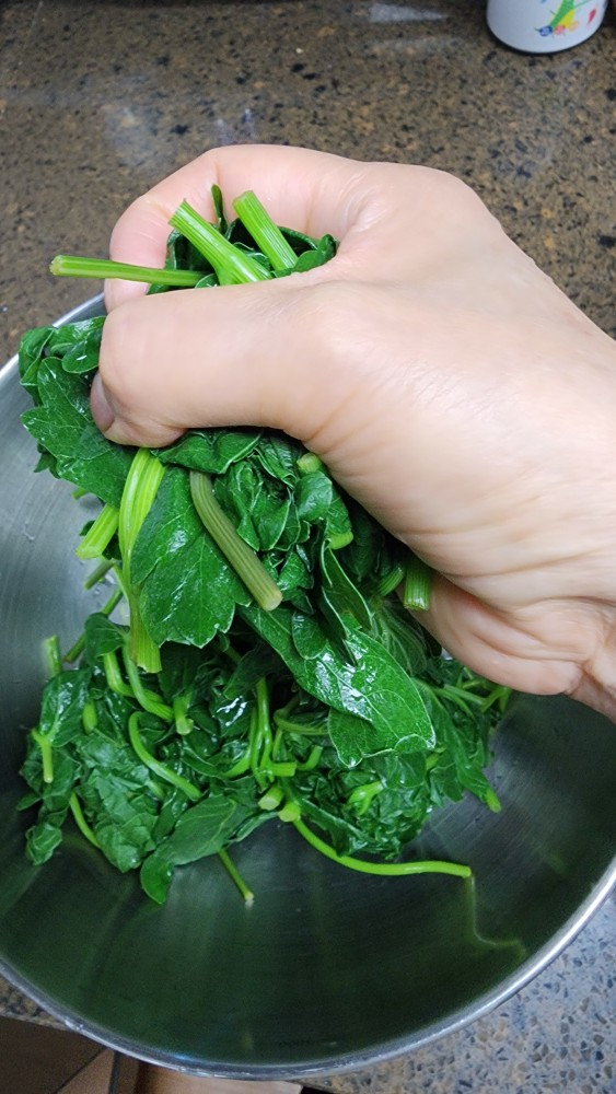데친 방풍나물을 한웅컴쥐고 양손으로 물기를 꼭 짜낸다.