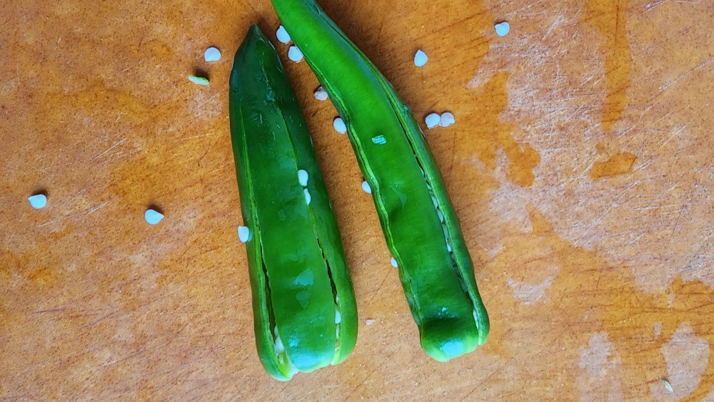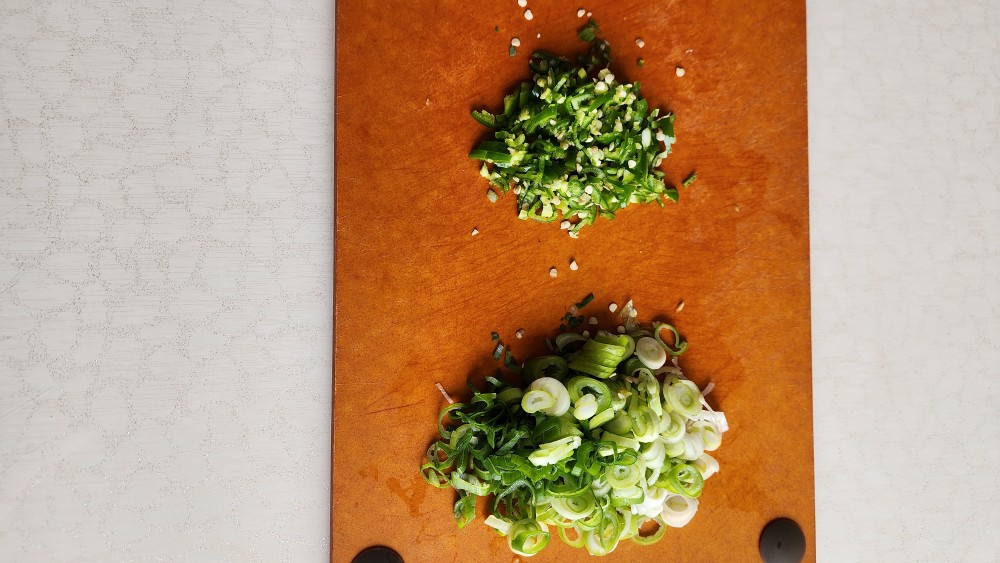 대파 1개, 청양고추 2개는 열십자로 칼집을 내어주고 가늘게 채 썰고, 대파도 채 썰어 준다.