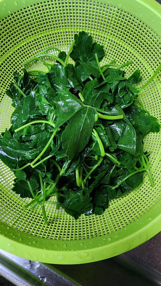 우선 봉지를 해체하여 억센 줄거지는 잘라주고 흐르는 물에 씻어서 소쿠리에 받쳐 놓는다.