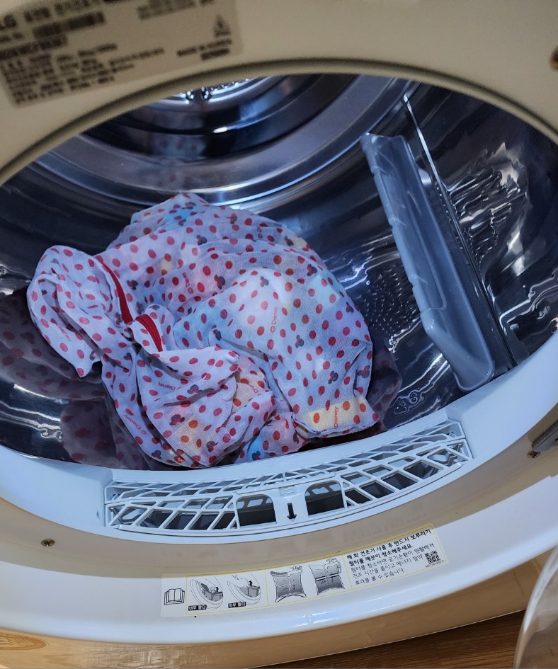 그만해도 되겠다 싶으면 깨끗하게 헹구어서 세탁망에다 넣어서 빨래 건조기에 넣어서 소독을 시켰어요. 건조시간보다는 세탁망이 바삭은 아니어도 말랐다 싶으면 그만 돌리고 내용물을 확인해 보세요. 물기가 없고 깨끗해졌으면 완료.