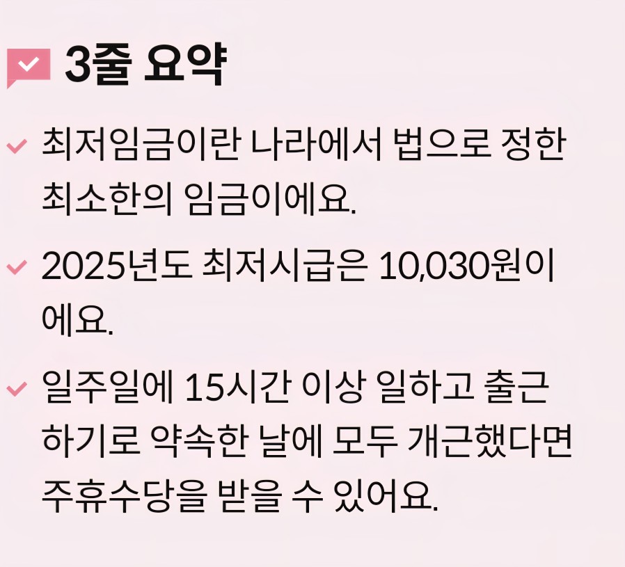 → 2025년 기준 시급 10,030원보다 낮게 지급하면 근로기준법 위반! - 주휴수당 포함 시 실제 시급은 더 높아집니다.